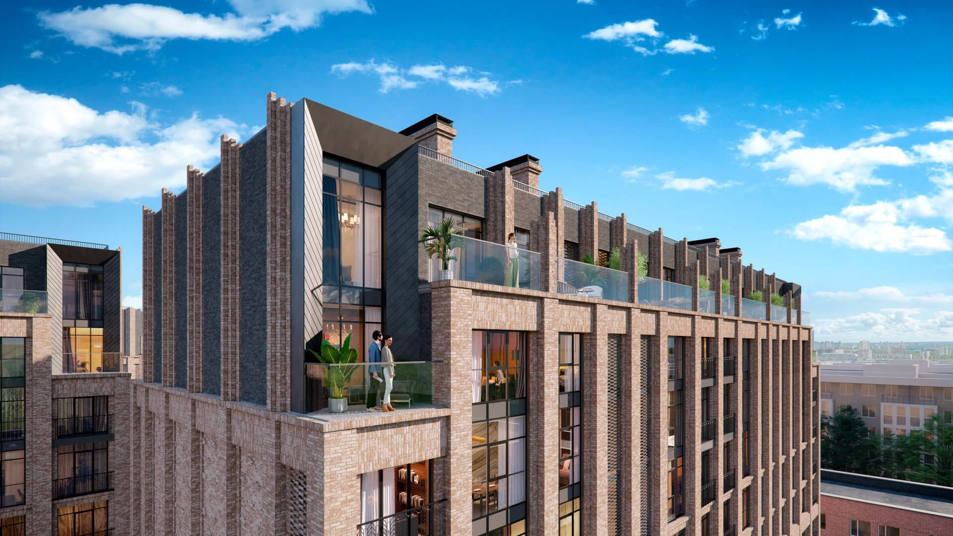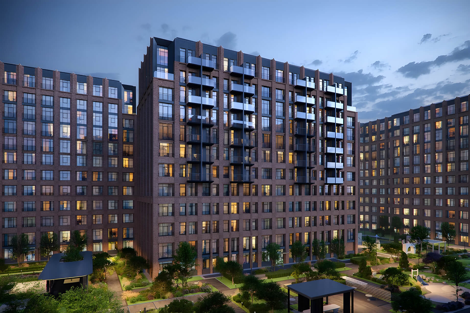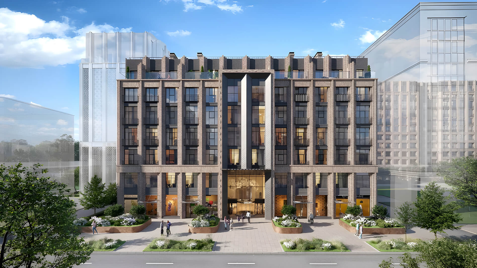 Особое внимание уделено фасадным решениям — они подчёркивают монументальность и статусность проекта. Архитектура отсылает к традициям петербургской застройки, но при этом выглядит актуально и современно. Визуальные акценты расставлены с помощью панорамного остекления, декоративных элементов и архитектурной подсветки. Каждое здание имеет индивидуальный облик, что придаёт кварталу живую структуру.