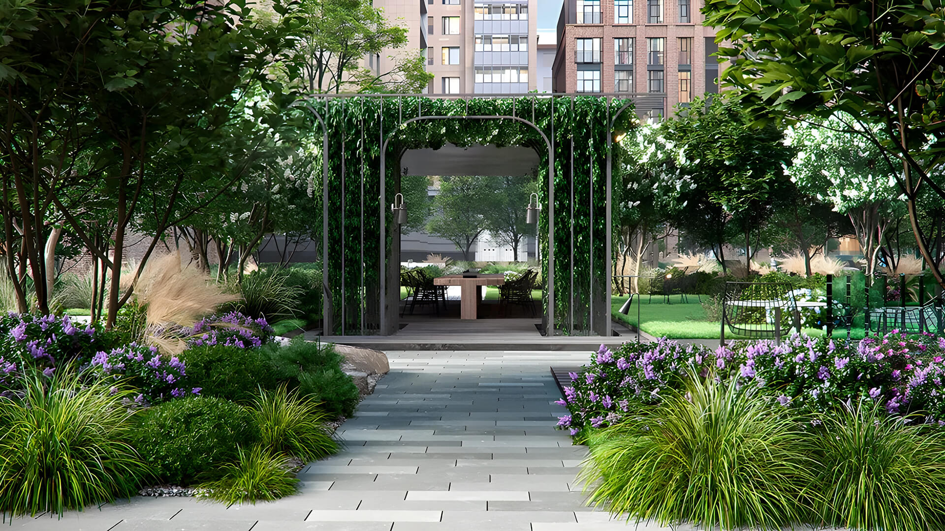 Пространство внутреннего двора комплекса «Ассамблея» выполнено в концепции приватного клубного сада. Здесь нет сквозных проходов и постороннего движения, что обеспечивает тишину, безопасность и камерную атмосферу. Жители могут наслаждаться отдыхом на свежем воздухе прямо у себя во дворе, не покидая пределы комплекса.