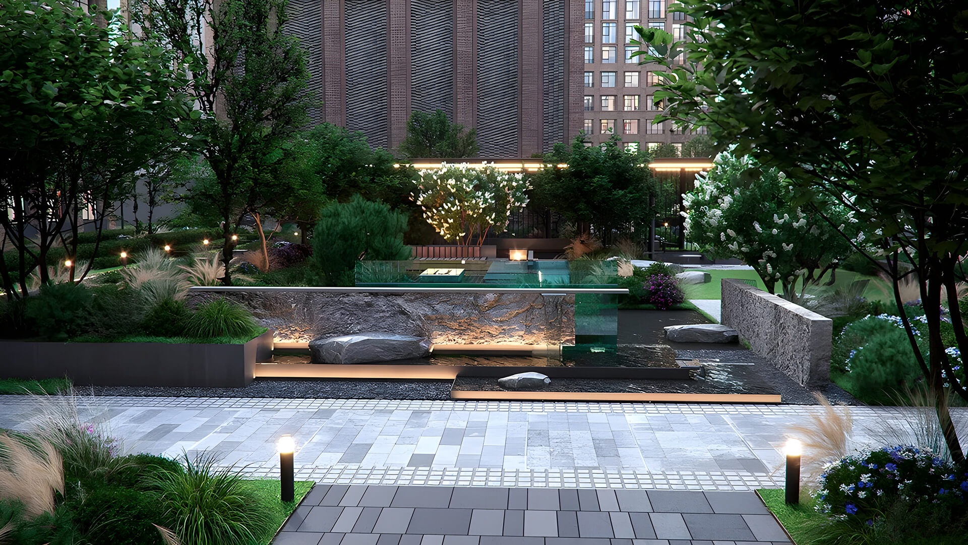 Зоны озеленения продуманы таким образом, чтобы создавать комфорт в любое время года. Комбинация хвойных деревьев, цветущих кустарников и газонов формирует живую и эстетически привлекательную среду. Пространство дополнено дизайнерскими скамейками, пешеходными дорожками и мягкой архитектурной подсветкой. Всё это создаёт уютную среду для прогулок, игр с детьми и общения с соседями.