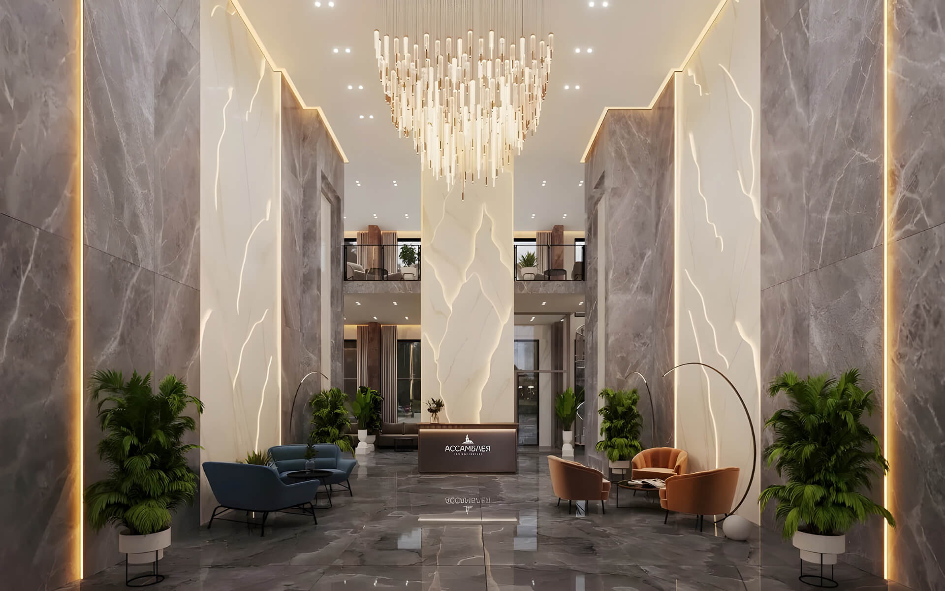 Гранд-лобби жилого комплекса «Ассамблея» — это пространство, в котором сразу ощущается премиальный уровень. Высота потолков достигает 7,7 метра, что создаёт ощущение простора и торжественности. Зона рецепции, оформленная в элегантном стиле, встречает гостей и жителей, формируя первое впечатление об уровне проекта.