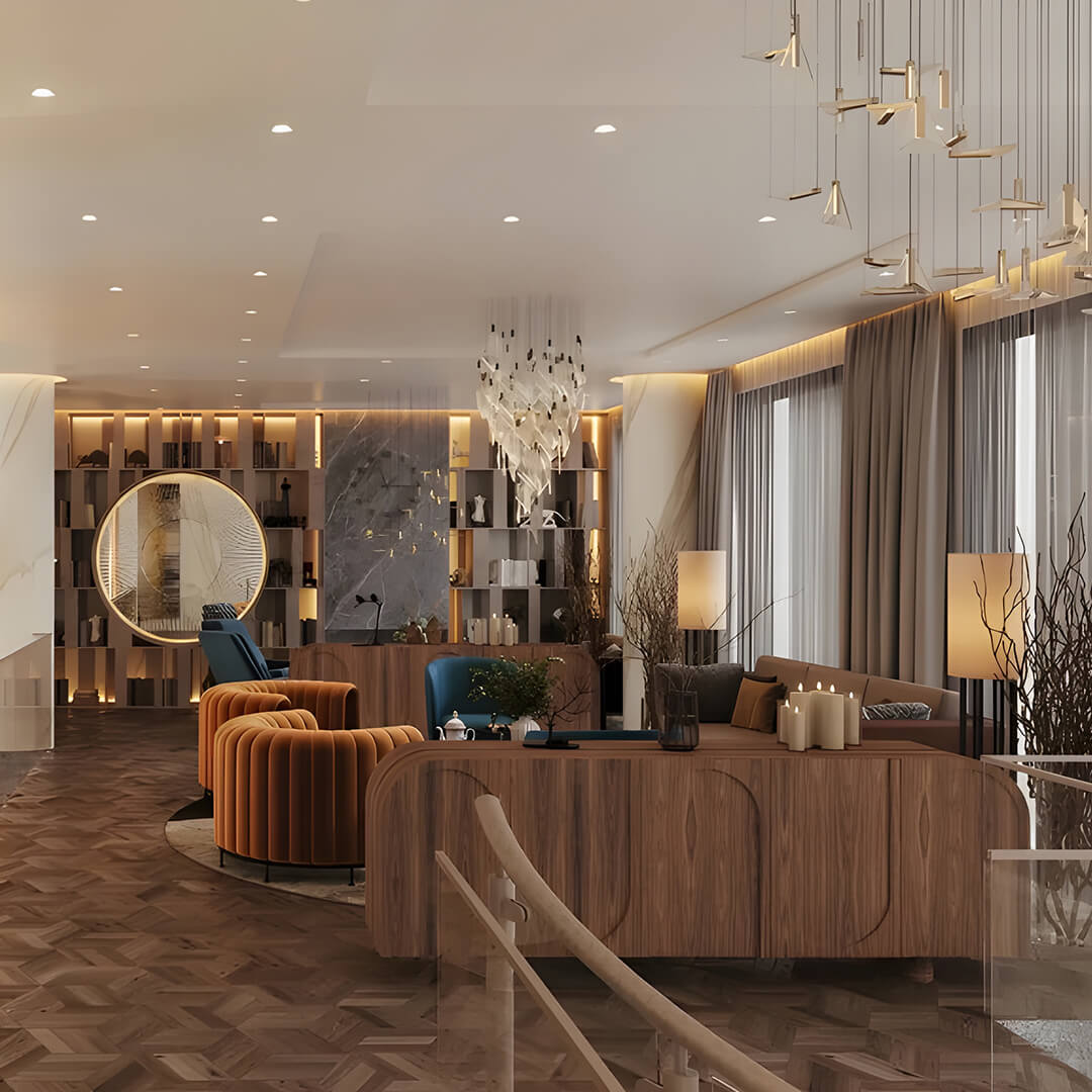 Клубная инфраструктура помогает жителям эффективно организовать свой день. Утром — спорт и работа, днём — встречи и переговоры, вечером — кино или общение с соседями. Всё это доступно на территории комплекса, без необходимости выезжать в город. Пространства оформлены в едином стиле с жилыми интерьерами, что поддерживает общий архитектурный язык проекта.